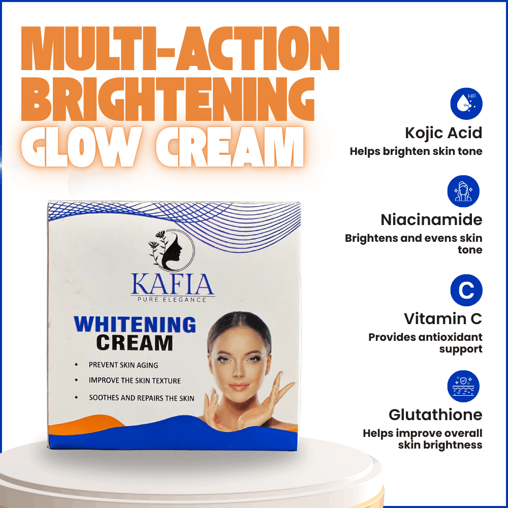 Kafia Whitening Cream is a multi-action formulation designed to target uneven skin tone, aging signs, and texture concerns. Enriched with potent brightening agents and restorative extracts, it works deeply to soothe, repair, and reveal a naturally luminous complexion. Ideal for daily use, this cream prevents skin aging while improving elasticity and smoothness.